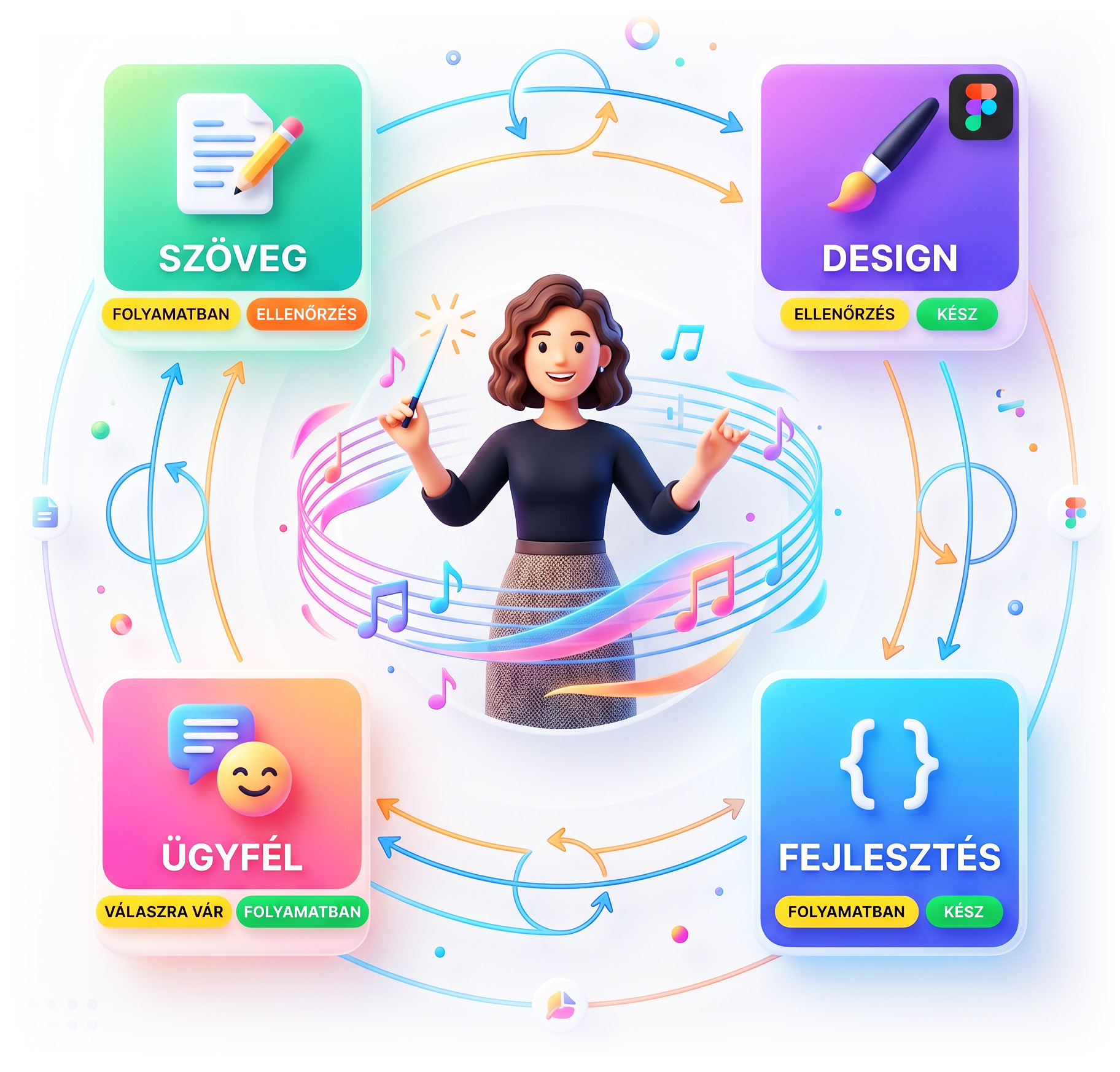 Fontos: összefogod az ügyfél, a szövegíró, a designer és a fejlesztő közös munkáját. Figyelsz, hogy ne csússzanak szét a részfeladatok, beszerzed a hiányzó információkat az ügyféltől, kordában tartod a visszajelzési köröket, követed a határidőket és jelzed, ha valami elakadt.
